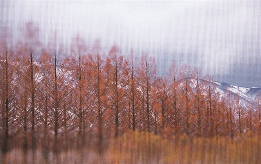 岡本先生がそもそも写真撮影に興味を抱いたのは、大学時代、採取した植物を学術資料として記録するためで、やがてはカメラの魅力にとりつかれ、「風景写真の第一人者」中村吉之介氏に師事し、北は宮城県から南は宮崎県まで足をのばし、≪好きなカメラで、好きな服装で、好きな愛車に乗って、毎週、毎月、毎年……今日まで現実と幻想の狭間に身を置きながら心象風景詩情を撮り続けた≫ その、こだわりのネガ写真より厳選された春夏秋冬の、心にしみいる全国津々浦々の風景が35点。