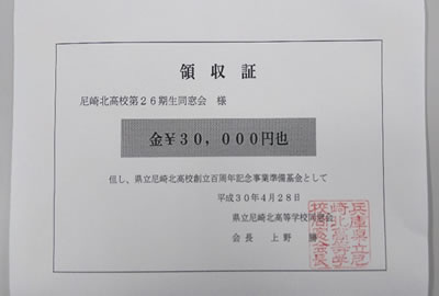 2月11日の「なんと還暦!学年同窓会」で了承をいただいた“当日の会費の一部を尼北同窓会に寄付する件、4月28日(土)に実施しましたので、報告いたします。