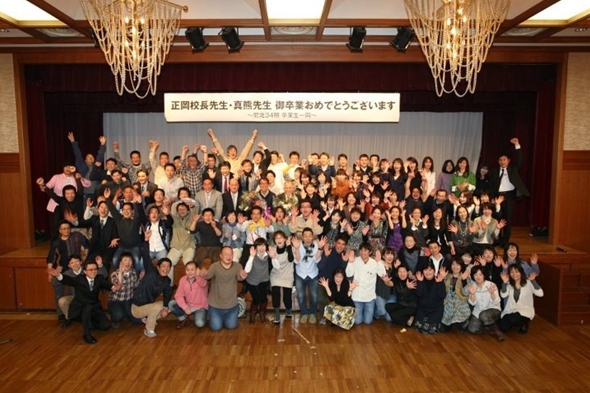 また、今回の同期会につきましては、正岡校長先生と真熊先生の卒業式の準備品の作成や、プロのカメラマンの段取り、横断幕、同期会記念シール作成と一部の34期生の多大な協力で運営出来た事に心より感謝をしております。副会長の横尾正人さん、鹿野芳弘さん、永田真弓さん、松浦幸子さん、永田隆之さん、そして当日受付や音響設備係り等をやって頂いた有志の34期生に御礼申し上げます。