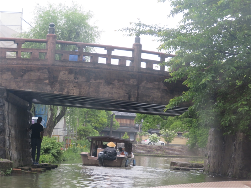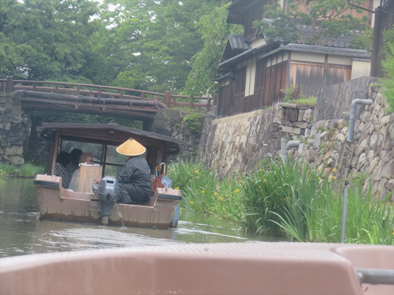 八幡堀めぐりは、花菖蒲が咲き時たま小雨が降って掘りめぐりに情緒を醸しだし楽しく遊覧できました。