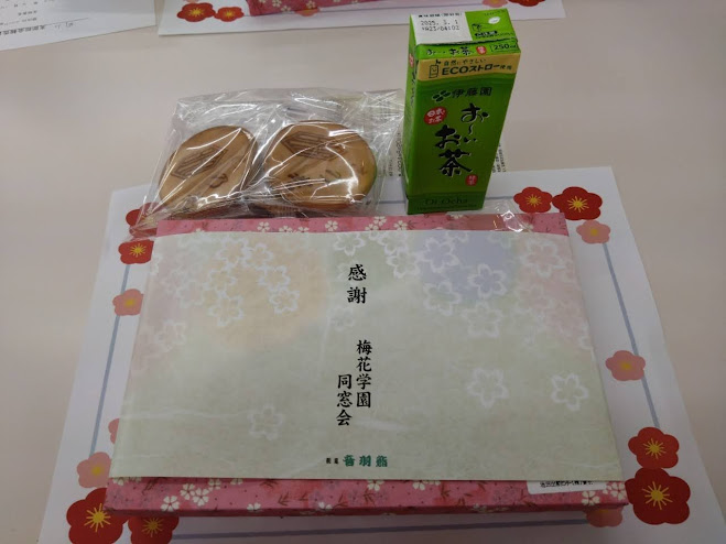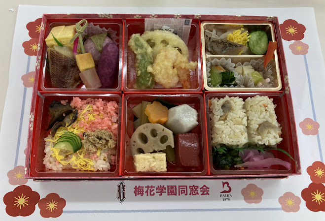 | 昼食:産学連携でお世話になっている音羽さんのお弁当と梅花せんべい(新たなお店に依頼して復活しました) | ||