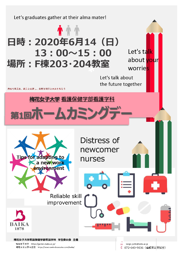2020年、梅花女子大学に看護学科が設立されて10年を迎えます。これまでの卒業生は500名を超えるに至りました。これも、卒業生の皆様の実績とご支援の賜と心から感謝申し上げます。この度、卒業生の親睦を深め、教員・母校との交流をはかるべく、ホームカミングデーを始めることとなりました。皆様が教員を交えて、近況やご活躍の様子、また看護学科の将来についてなど、気軽に語り合っていただく機会になればと考えておりま