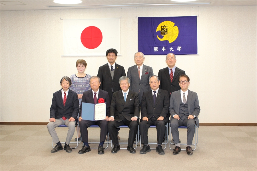 武夫原会からは、河村久幸様(S49.3法文・法卒)が受賞されました。小川久雄学長から表彰を受けたあと、記念撮影が行われました。誠におめでとうございました。