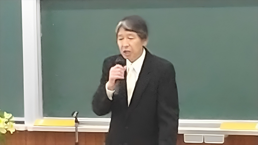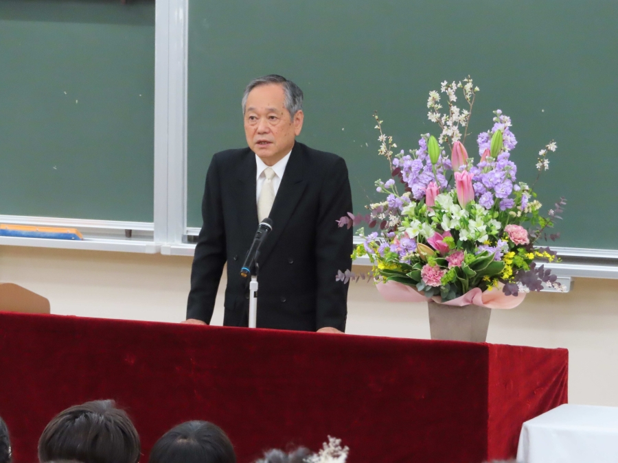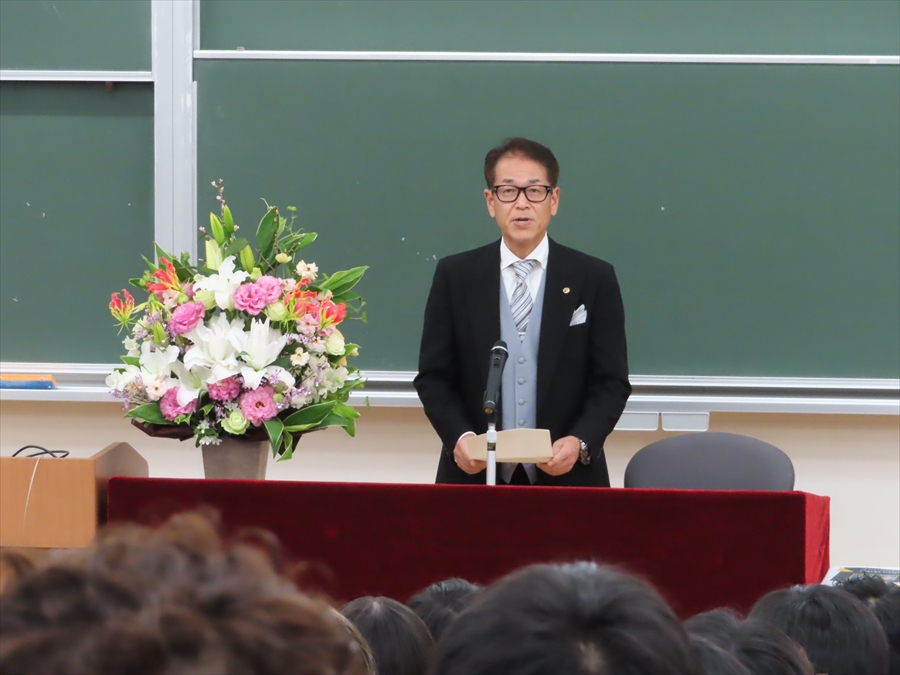 | 法学部卒部式でお祝いの言葉を贈る村田会長 |