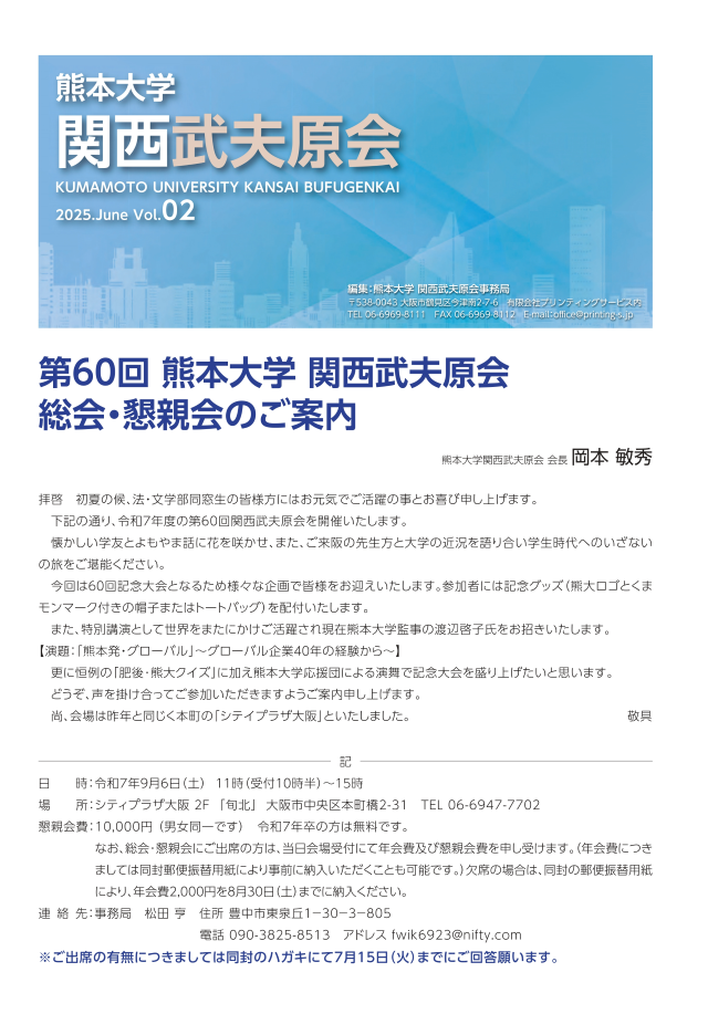 令和7年9月6日(土)シテイプラザ大阪にて第60回熊本大学関西武 夫原会総会・懇親会が開催されました。会員やご来賓の方等を含めて総勢65名の参加でした。