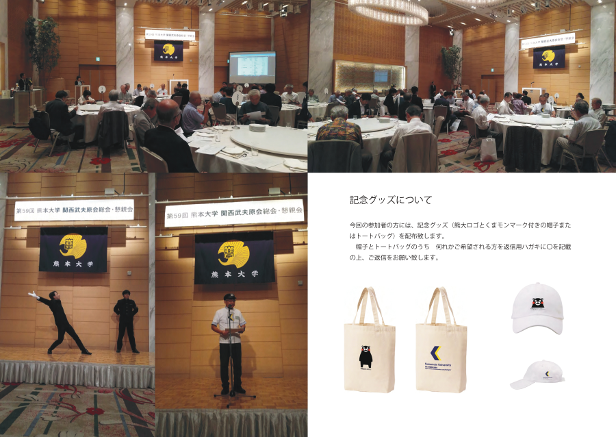 今回は第60回の記念大会となる為、熊大ロゴとくまモンマークの入った帽子とトートバッグを作成しました。そして記念品として、参加された方全員にどちらかをお渡しすることにしました。