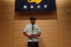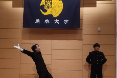 続いて遠隔地参加者、初参加者のご紹介ですが、何と恐竜君2名が先導します。熊本が実は恐竜王国であることを改めた知らされた瞬間でした。熊本大学応援団員2名が演武を行い、全員で五高寮歌を斉唱し、踊りました。
