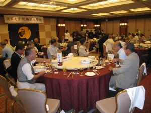 中に入ると、テーブルが38もあり参加人数は400名を超えていたのではないでしょうか。我々関西武夫原会は志文会(熊本学園大学OB)の方と同テーブルであり、志文会の中にはゴルフ会を通じて存じ上げている方もおられた為、和気藹々としたムードです。