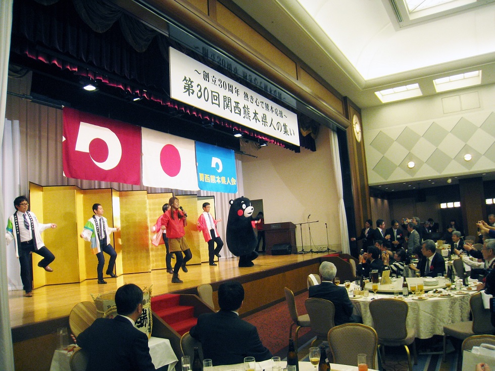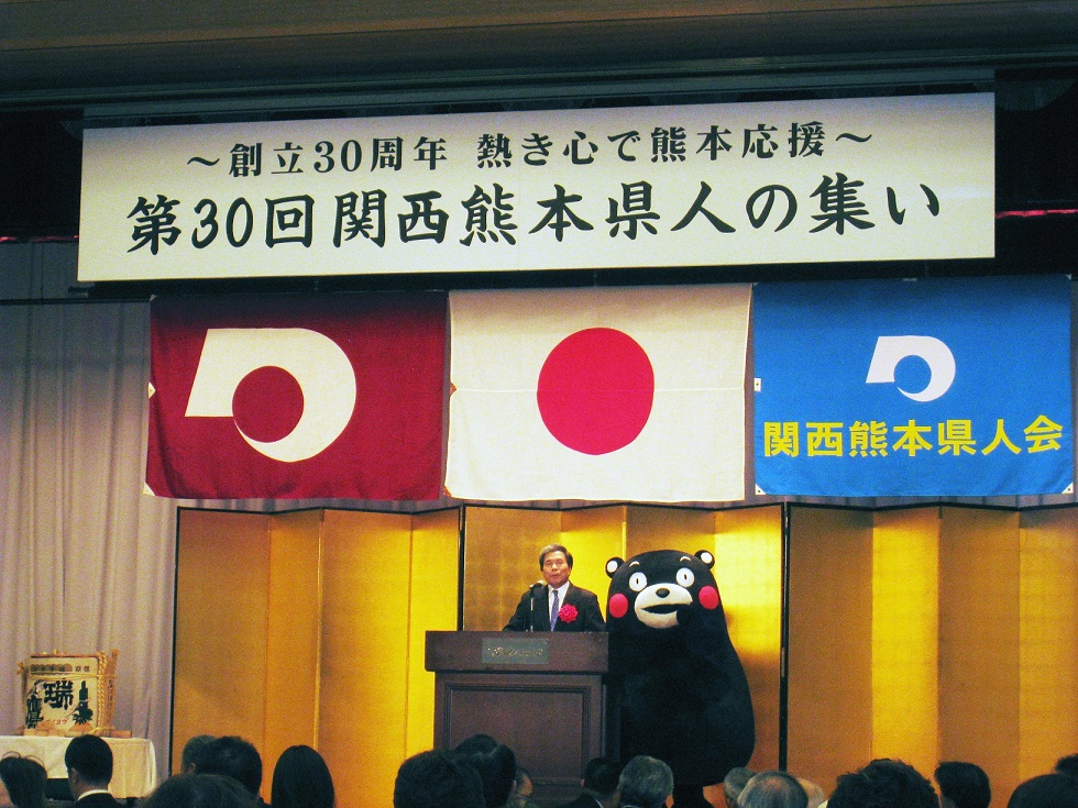 「集い」は宮崎会長の力強い開会宣言でスタート。来賓である蒲島熊本県知事のご挨拶の途中に「くまもん」が登場し、知事と共に熊本県をアピール。