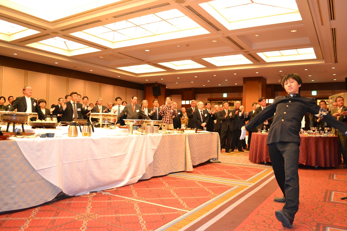 交流会もそろそろ終宴、恒例の「五高寮歌」です。いつもの様に土木OB氏による愉快な飛び入りも花を添え、西本徹第42代応援団長による巻頭言でさらに気勢を上げ、全員で「武夫原頭に草萌えて」を合唱しました。