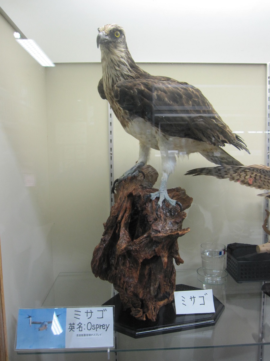 また、ビジターセンターでは、箕面公園で見られる動植物の展示があり、猛禽類のはく製も展示していました。「みさご」(鷹の仲間)の英名があの「オスプレー」だと知りました。