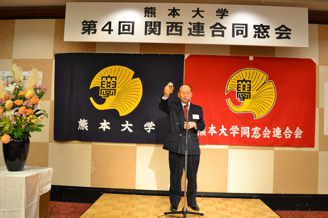 平成26年11月29日、定刻の13時30分、江上眞一司会者(工業会京滋支部長)のハギレ良い第一声により、第4回関西連合同窓会が188名の参加者を得て、太閤園にて盛大に行われました。先ずは、関西連合同窓会 西山多加志会長のご挨拶、そして、熊本大学同窓会連合会 岡村宏会長のご挨拶と続きます。