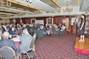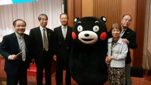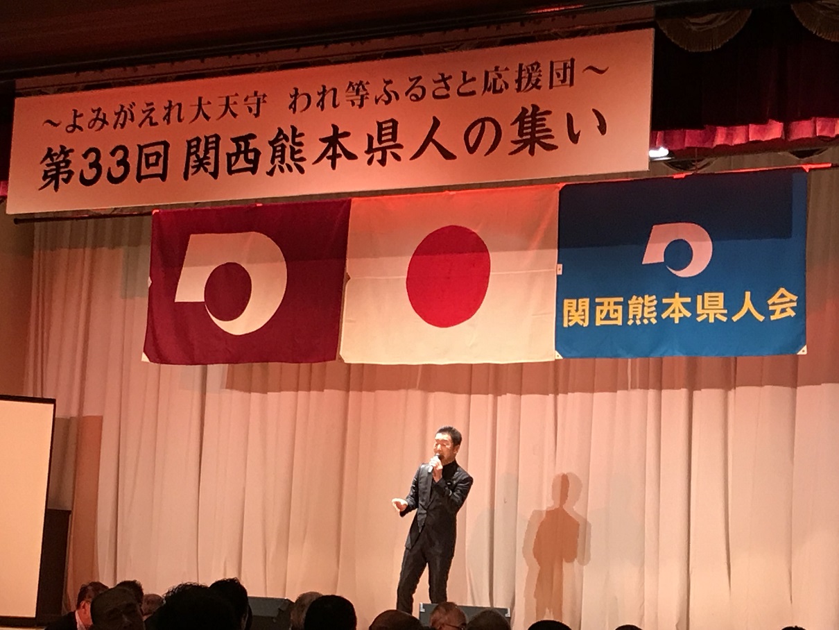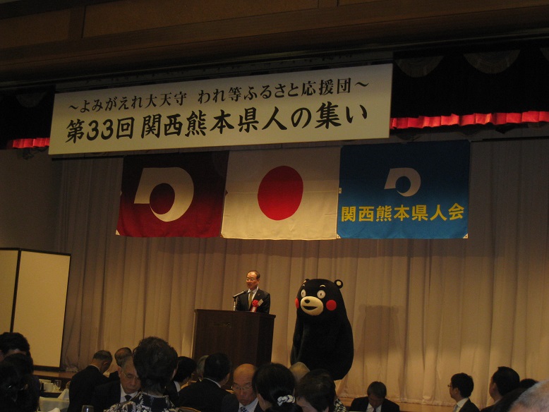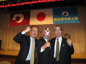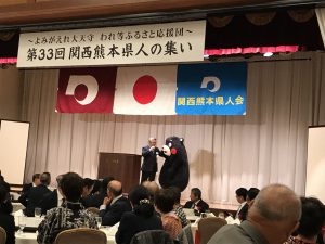 宮崎会長の挨拶の中で、特に心に残ったのは、熊本地震復興に関して、関西鹿児島県人会の方々が多大な協力をしてくださったということ。幾重にもお世話になったこと、本当に有難いと思いました。宮崎会長はくまモンとの会話に、とても慣れておられるようでした。