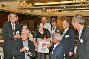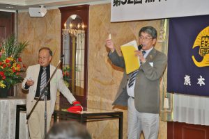 懇親会では熊本から取り寄せた辛子レンコンや馬刺しに舌鼓を打ちながら世代を超えて当時の話に花を咲かせ、またアトラクション企画も盛況で、法・文学部長とのじゃんけん大会、恒例のビンゴゲームなどで大いに盛り上がりました。