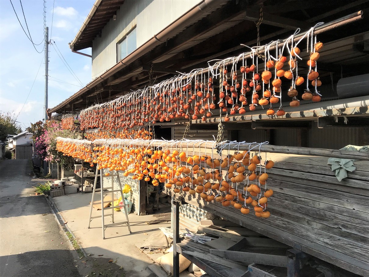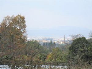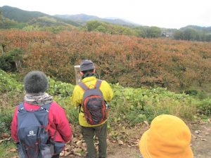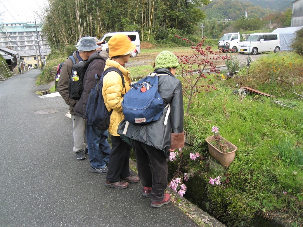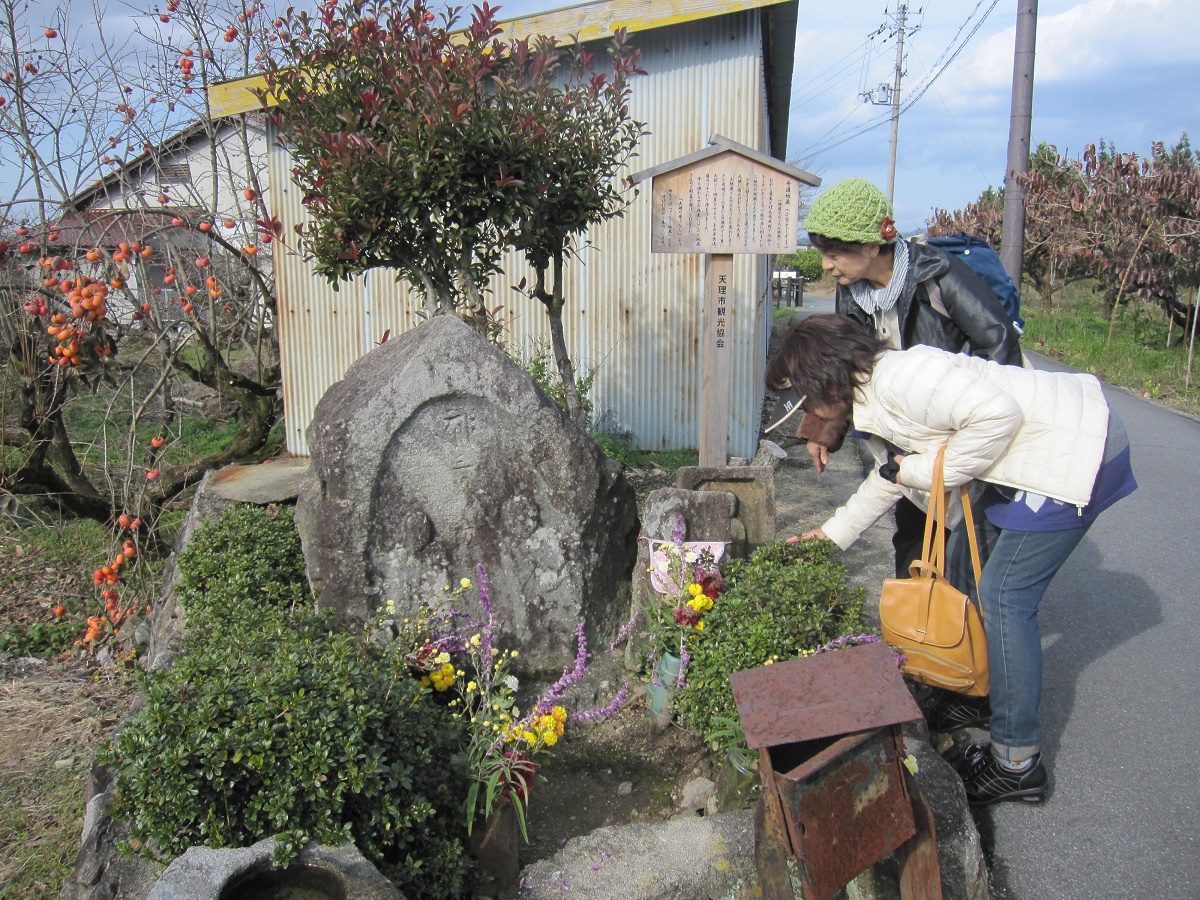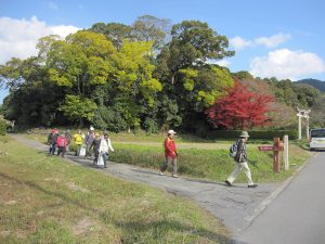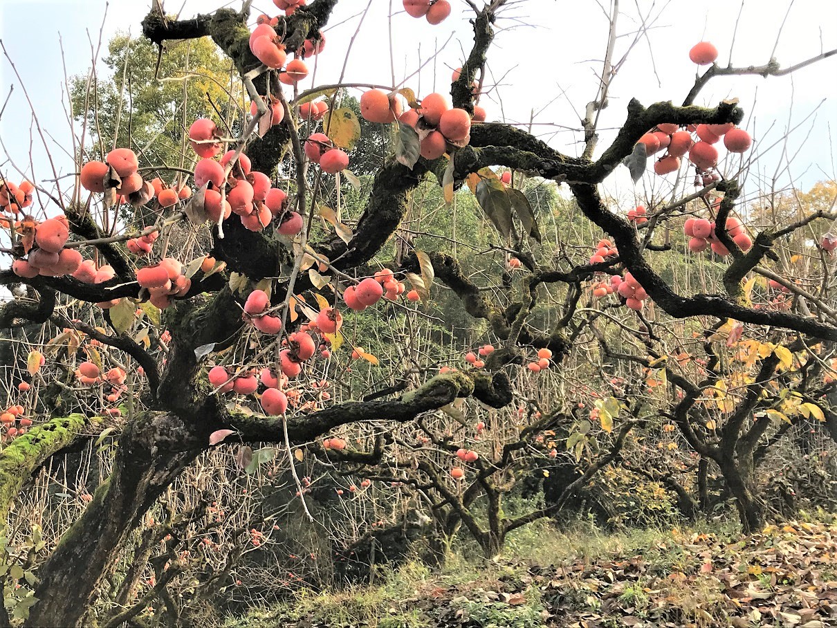 モリアオガエルが生息する池がある石上神宮はうっそうと木々が茂り、ここを抜けて柿畑の間の里道を進む。農家の庭先に咲く花の名前を教えあったり、無人の販売所に並ぶ野菜・果物を品定めしたり。柿の木には収穫が終わったものがある一方色付いた葉とともに熟した柿が鈴なりとなっているものがあり、秋の深まりを感じた。内山永久寺跡で小休止。廃仏毀釈で今は小さな池だけが残っていたが、展望台からは天理の街並みが綺麗に見えた。