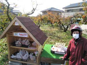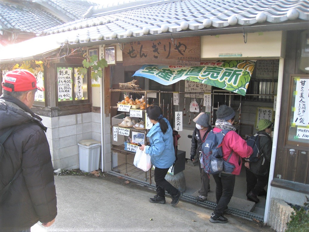 高台に作られた休憩場所から西の方角を見渡すと生駒山から葛城山、金剛山へと連なるパノラマ。その手前には三角形に耳成山が小さく見えた。今回のコースの最後に予定した長岳寺はスルー。JR柳本駅で来年春の桜の頃の再会を約して解散となったが、多くの参加者が有人・無人の販売所で買った新鮮で美味しそうで安い(一盛100円)野菜や果物のビニール袋をお土産に持ち帰っていたのが微笑ましかった。