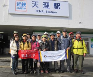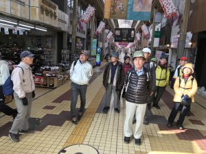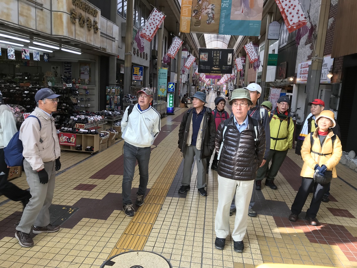 駅前で熊本大学のタオルを広げて記念撮影をした後早速歩き始めた。宗教都市(?)天理のアーケード街は熊本の上通り、下通りの2倍はあるのでは、と思うほど長く続き、衣料品、靴、文房具の店などが平台やハンガー陳列して昔懐かしい雰囲気を醸す。