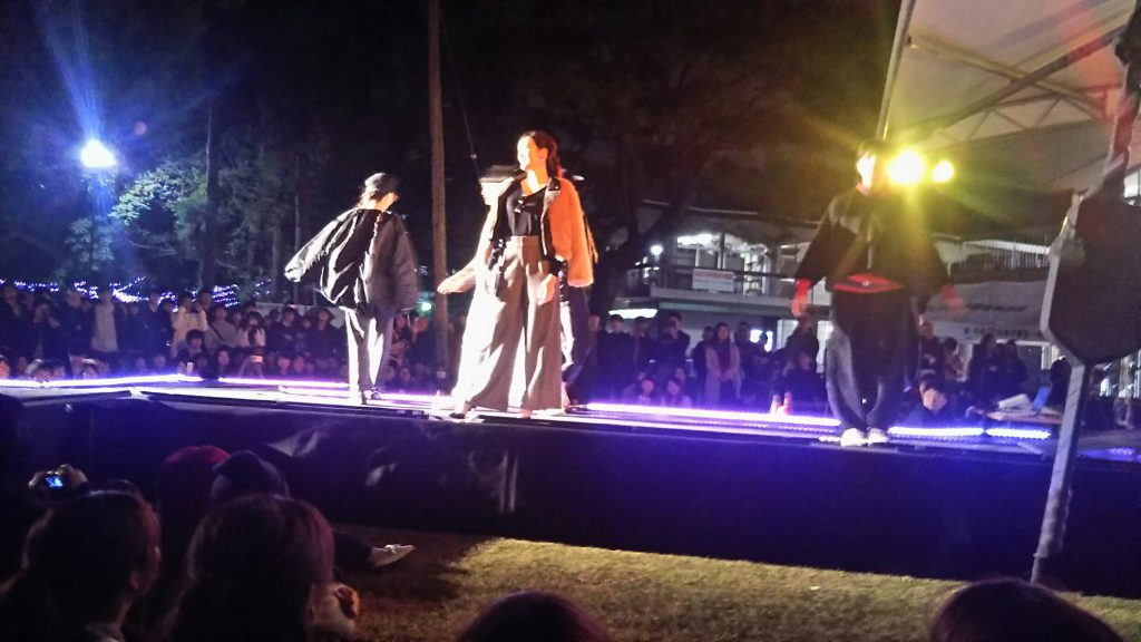 学生会館前にメインステージが設けられ、若者特有の音楽をバックに闊歩するモデルさんにスポットライトをあてるもので、我々の学生時代には考えもしなかったようなものです。(費用もかかったはずですが、一般企業の協賛もあったのでしょう)
