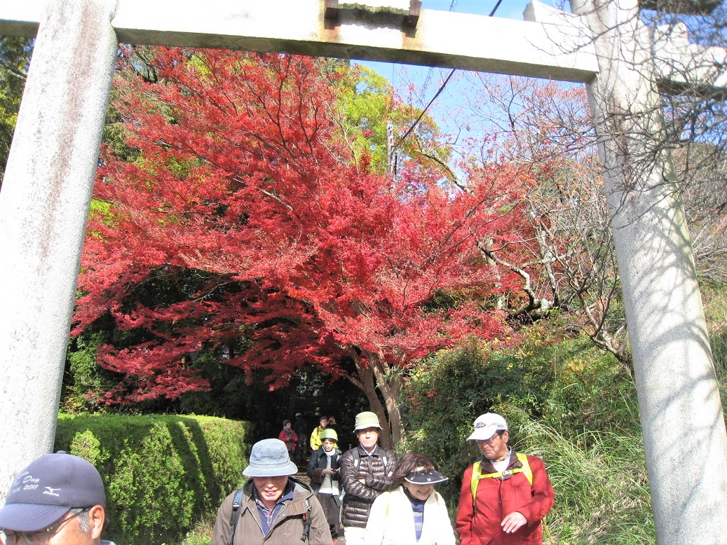 夜都伎神社の入口の紅葉は青空を透かして真っ赤に燃えており格別だった。