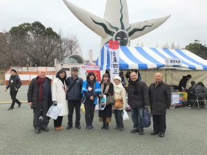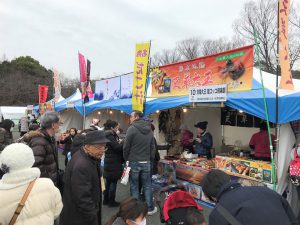 この後は広場後方に設置された各売り場で、買い物を楽しみました。辛子蓮根、こっぱ餅、ちくわサラダ、塩唐揚などを買いました。気が付くと県人会などで知り合いになった方がたくさん来られており、みんなで写真を写しました。