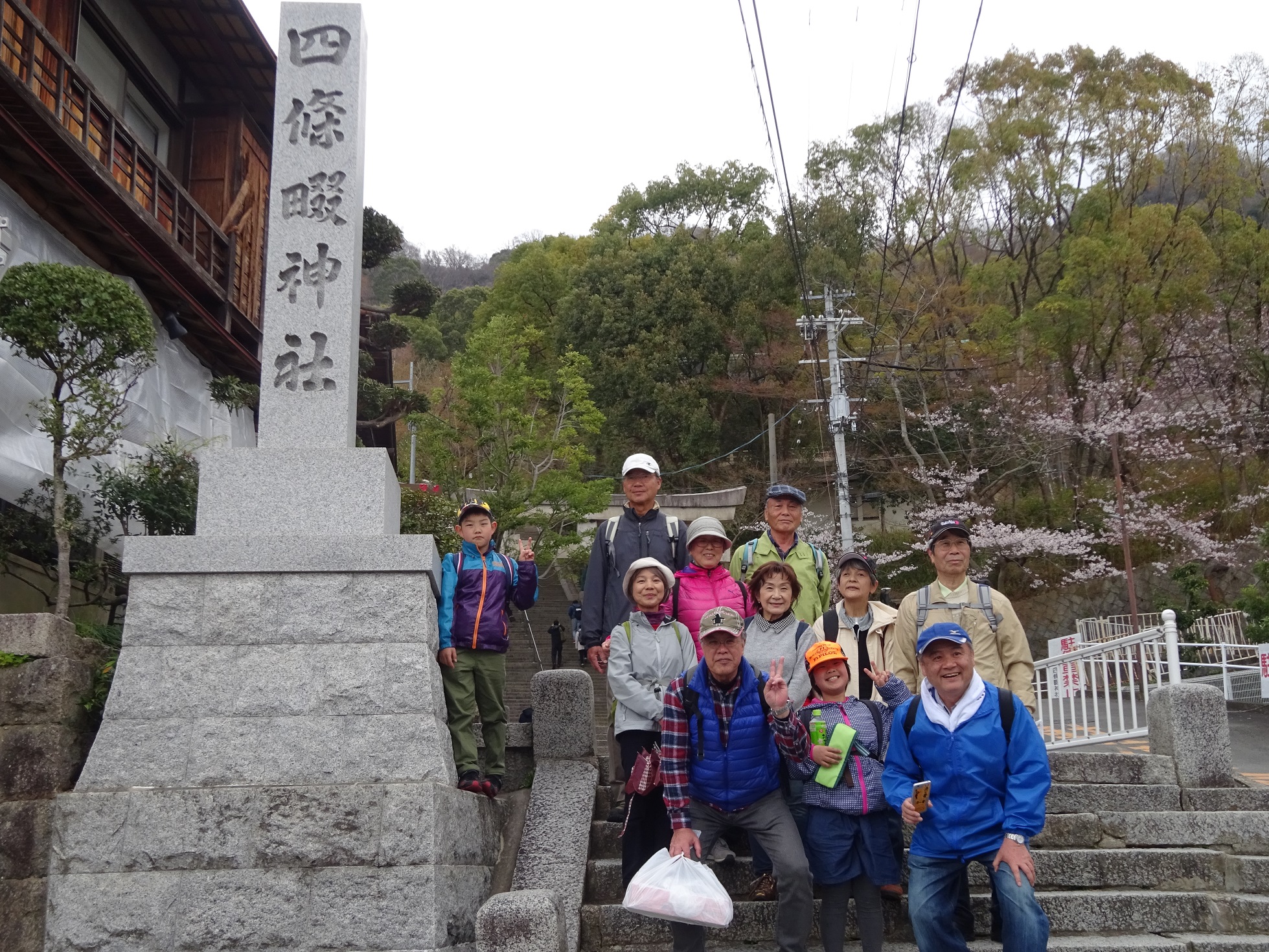 この後四条畷神社まであと1キロぐらい、平地なら歩いて行きましょうということになりました。神社の参道は紅白の桃や桜の木できれいでした。でも、登り坂その後、どーんと階段が目の前にあります。「えーっ」という声のせいかどうか、ここ神社の階段下で「解散」ということになりました。ところが、お参りを済ませて周りを見ると全員揃っています。皆さん(私もそうですが)せっかくだからと思われたのでしょうね。
