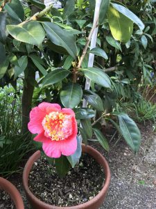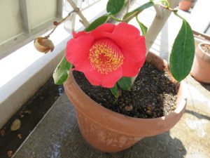 昨年に挿し木したばかりなのに、今年、早くも花が咲きました。葉っぱの長さと同じほどの身長ですが、窮屈なプランターの中でしっかり肥後椿を主張しています。