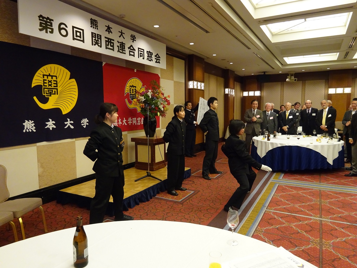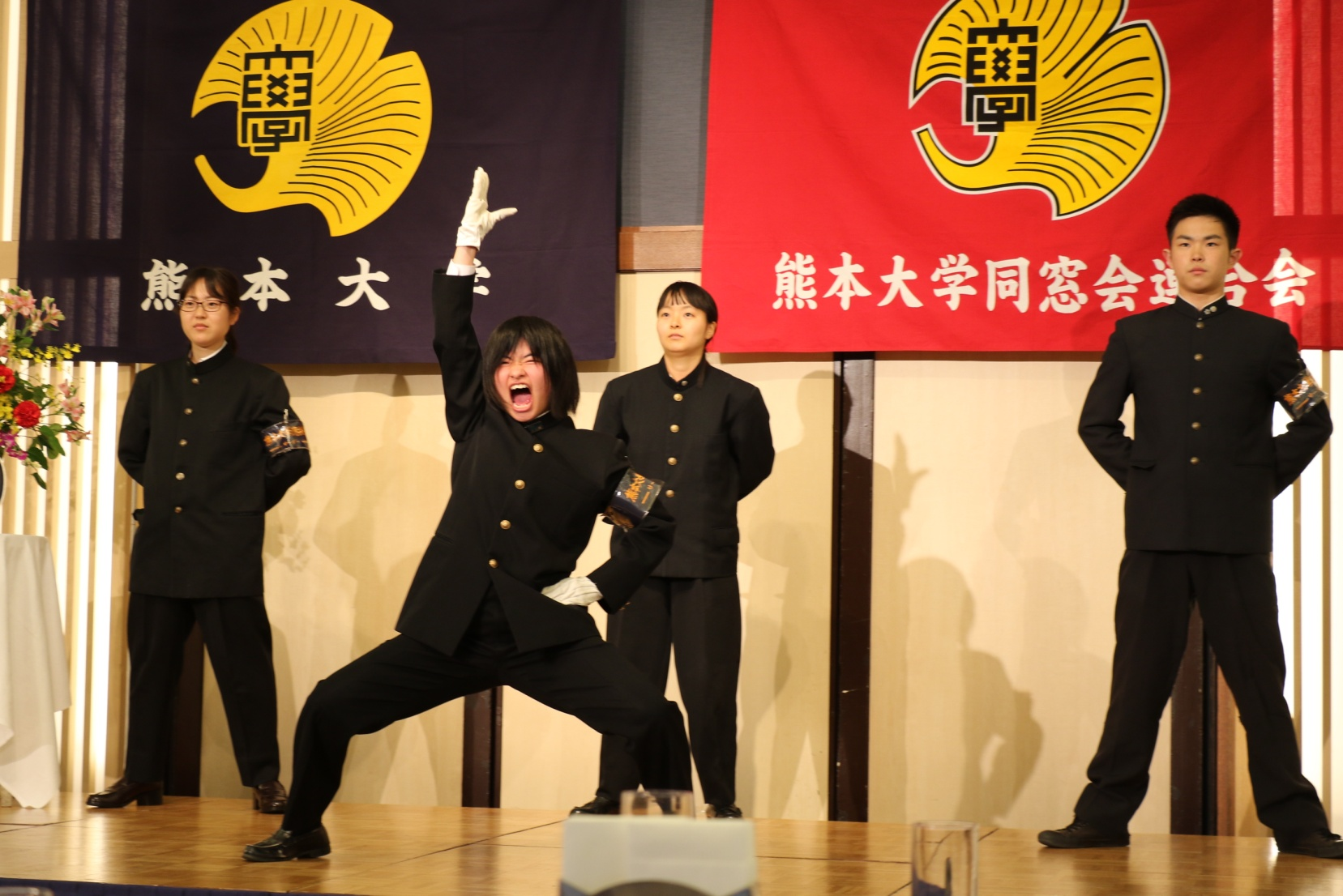 最後は恒例の応援団による巻頭言と五高寮歌斉唱、中村あゆみ団長が4年生として東京での最後の演武とのことで、より一層力が入っていました。新入生が入団するまでの3年間、女性一人で頑張ったのは、お見事でした。〆は瀬崎東京連合同窓会副会長による閉会の挨拶、次回の再会を約してお開きとなりました。