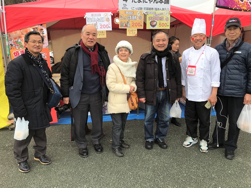 この後は広場後方に設置された各売り場で、買い物を楽しみました。辛子蓮根、こっぱ餅、ちくわサラダ、塩唐揚などを買いました。気が付くと県人会などで知り合いになった方がたくさん来られており、みんなで写真を写しました。