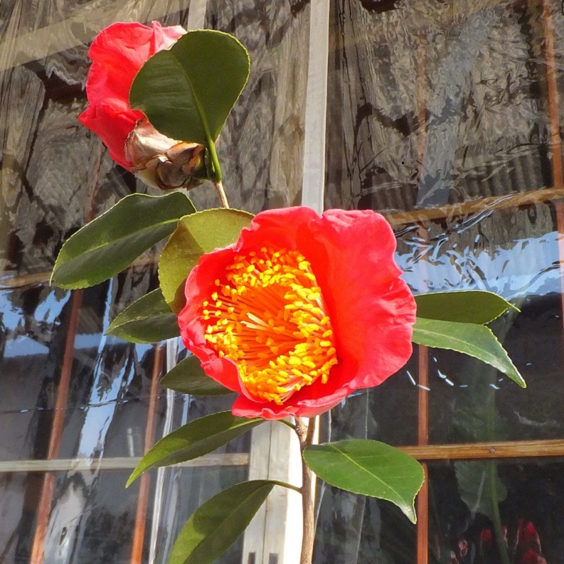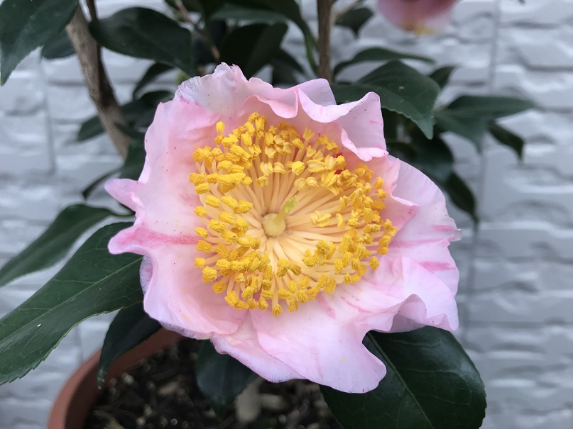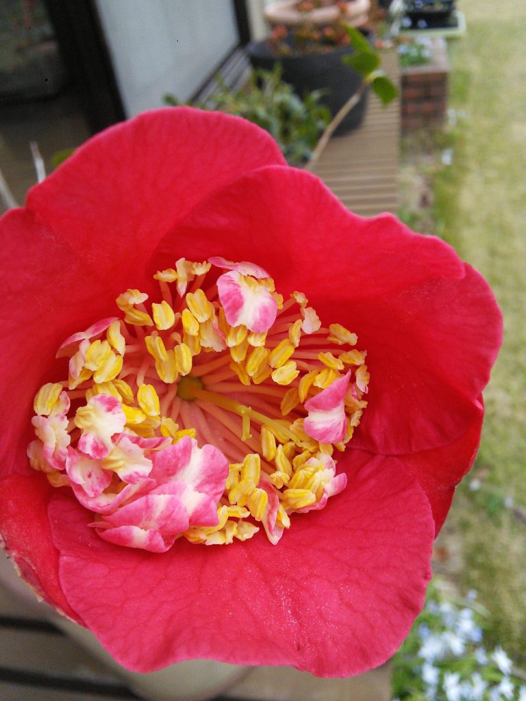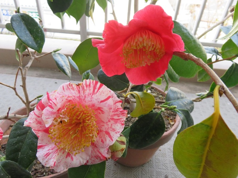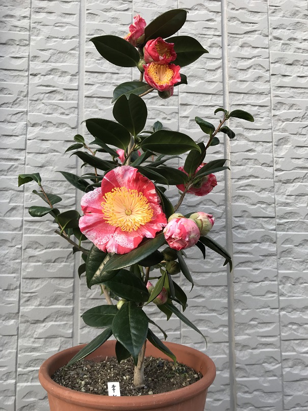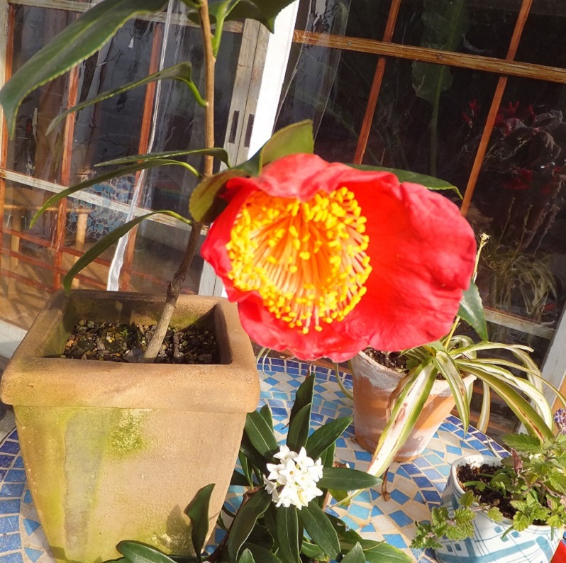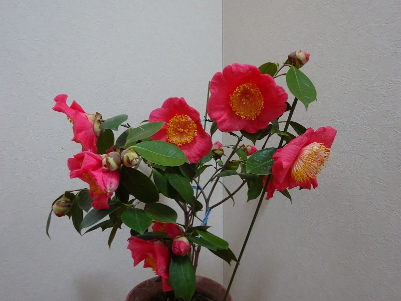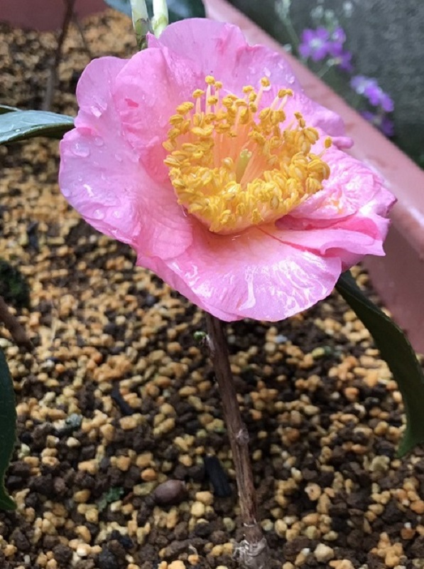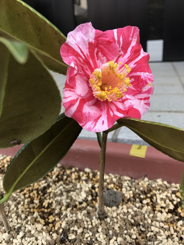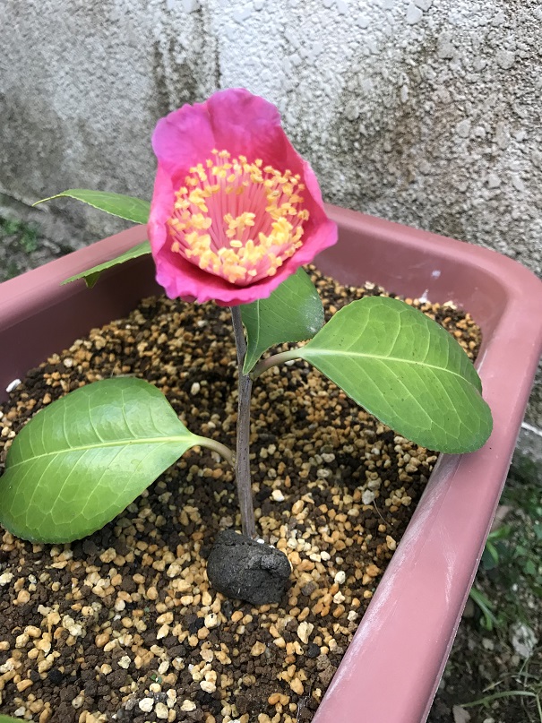 昨年に挿し木したばかりなのに、今年、早くも花が咲きました。葉っぱの長さと同じほどの身長ですが、窮屈なプランターの中でしっかり肥後椿を主張しています。