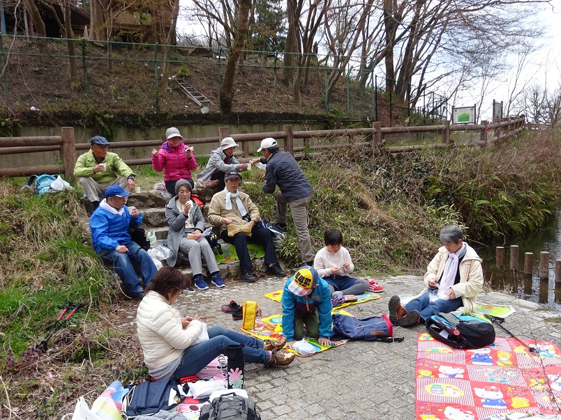 残りは昼食予定地である活動センターで待つことになりました。飯盛山までの道は可愛いオブジェもあったし、「皆来たら良かった、今までの道よりもずっと楽?だったのに」とは元気者の女性の弁。活動センターの池の畔で思い思いのお弁当を広げ、つくしの卵とじも喜んでもらえたし、デザートに熊本の苺、ゆうべにも頂き、とても贅沢な気分になりました。すぐそばで釣りをしていた人が針を遠くの木の枝にからませたときは皆心配し、無事外れた時は皆で拍手。何と賑やかで楽しいひと時であったことか。