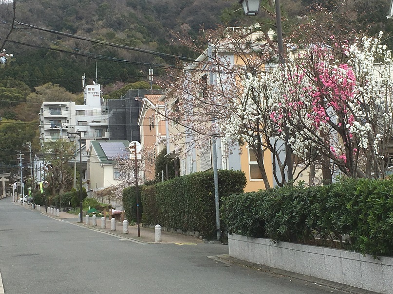 この後四条畷神社まであと1キロぐらい、平地なら歩いて行きましょうということになりました。神社の参道は紅白の桃や桜の木できれいでした。でも、登り坂その後、どーんと階段が目の前にあります。「えーっ」という声のせいかどうか、ここ神社の階段下で「解散」ということになりました。ところが、お参りを済ませて周りを見ると全員揃っています。皆さん(私もそうですが)せっかくだからと思われたのでしょうね。