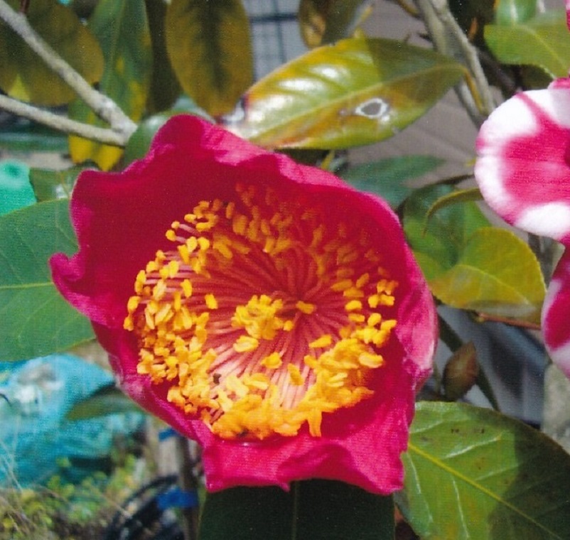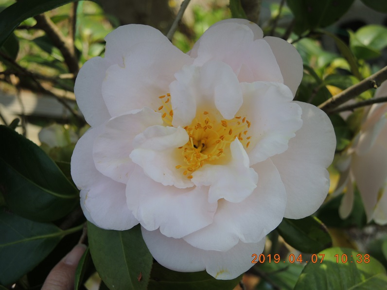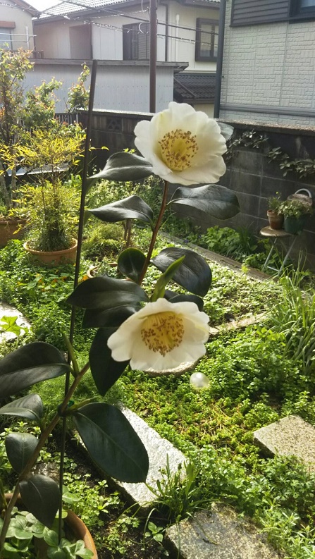 白い花は「暁香」、肥後椿らしくない肥後椿ですが上品な香りを放ちます。