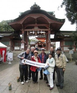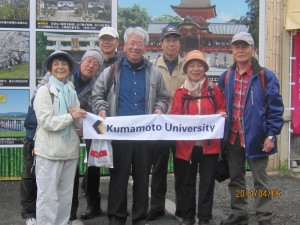 写真スポットを見つけると、Kumamoto University の旗を広げ、シャッターを押してくれる人を見つけ出す私たち!かなり目立ってはいるけど、やっぱり楽しい。次は、皆さんもご参加ください。