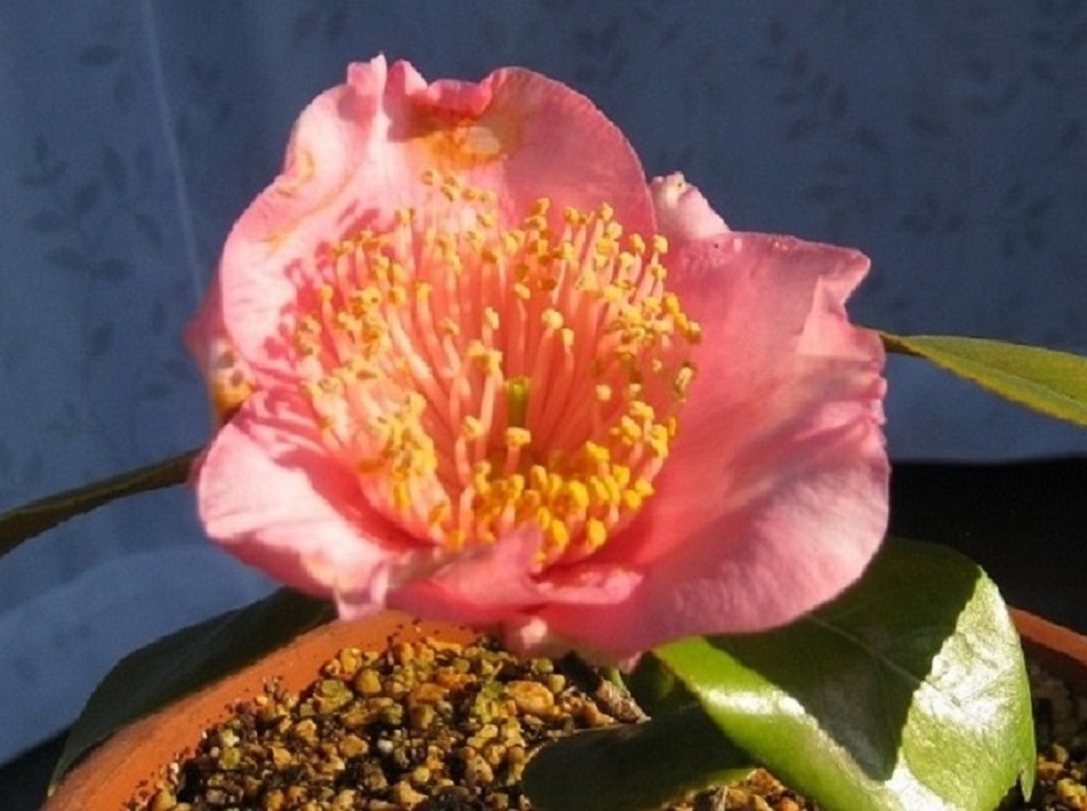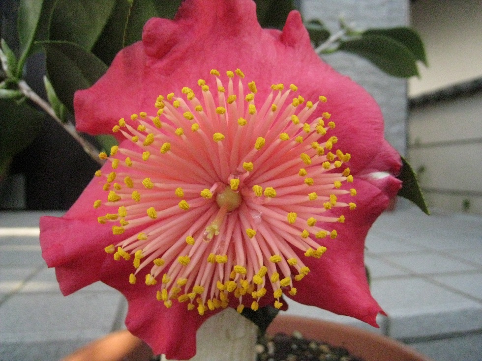 肥後椿は花弁数が5枚程度で雄しべが底部まで分岐し、梅の花のように放射状に開いているのが特徴です。花の色や模様・濃淡が多彩です。肥後六花として肥後椿のほかに肥後山茶花、肥後朝顔、肥後花菖蒲、肥後菊、肥後芍薬があり、18回生 Iさんが肥後山茶花の写真を送ってくれました。
