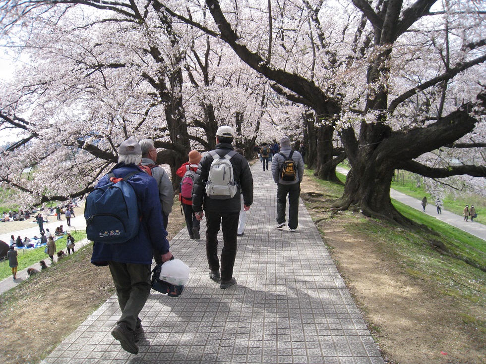 春に3日の晴れはなし、とか言いますが、この日の天気予報も直前まで不安材料がいっぱい。それでも、「決行!」の連絡を受けて、八幡市駅前に集まったのは、男性5名、女性2名の7名でした。出会って、先ずは、お天気の話題。1日なんとかもつのでしょうか?心配です。でも、そんなお天気にも関わらず、予定通りのお花見をしようと、駅前には大小、たくさんのグループがひしめいておりました。ツァーの旗もいくつか見かけます。私たちのグループはこじんまりとして動きやすい人数です
