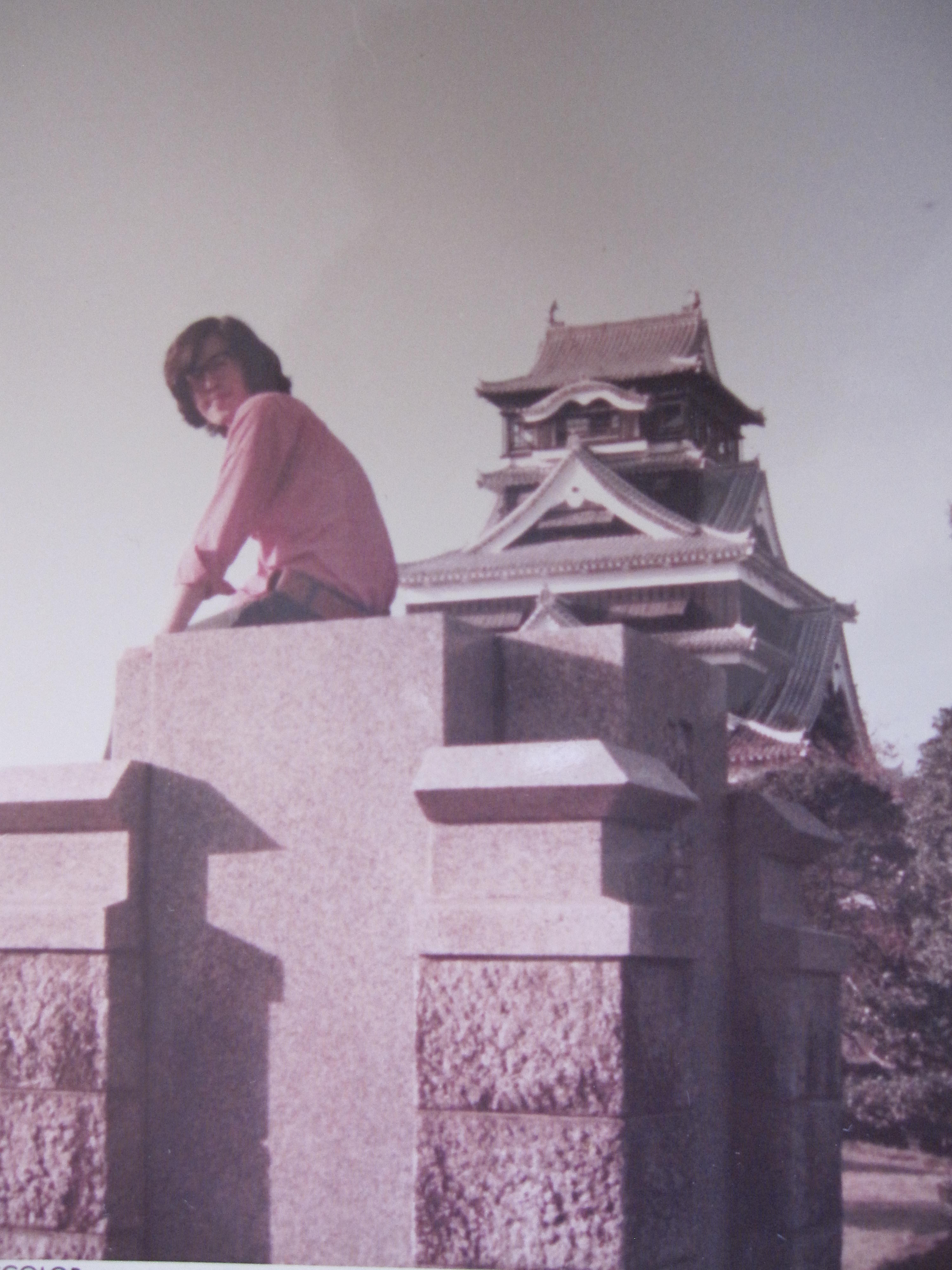 残っているそんな中、1年生から授業もありました。教養学部の授業で専門の法学の講義もあり、ある日講義の中で「法律は身体の骨の部分である。その上に肉である慣習や服である道徳がある。骨の部分まで行かない状態で物事が解決すれば一番良い。」と言った内容のお話がありました。「そうなんだ。法律の前段階で解決させれば法律を勉強しなくて良いのだ。」と悟り?、勉強もそっちのけで、やんちゃんな、長髪にパーマをかけ、Gパンをはいたノンポリの学生が誕生しました。(写真:18歳の私 熊本城をバックに)
