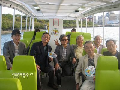 いよいよ水陸両用バスに乗車(船)です。陸上60分、水上30分で、御堂筋、本町通、上町筋を大阪城を眺めながら走り大川へ入水し(この時、運転手が船長と交替)、中の島公園付近まで回遊するコースでした。ほぼ貸切り状態で、日本初の水陸両用の珍しさと如何にも大阪のお姉ちゃんと呼ぶにふさわしい?明るい大声の身振り手振りの派手なガイドさんのお陰でとても愉快でした。