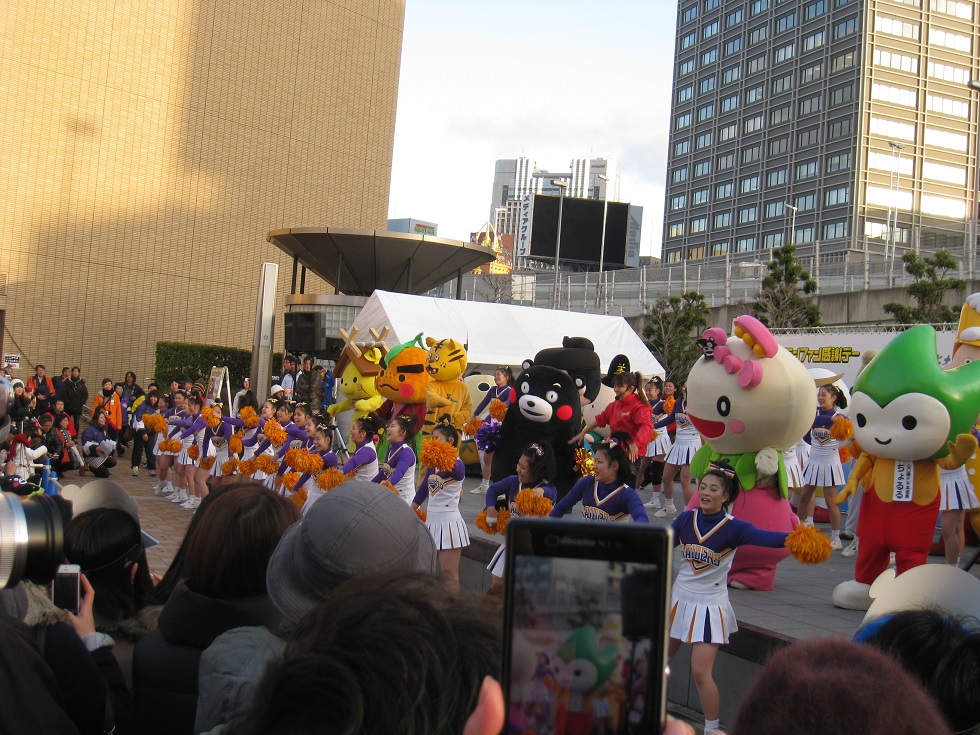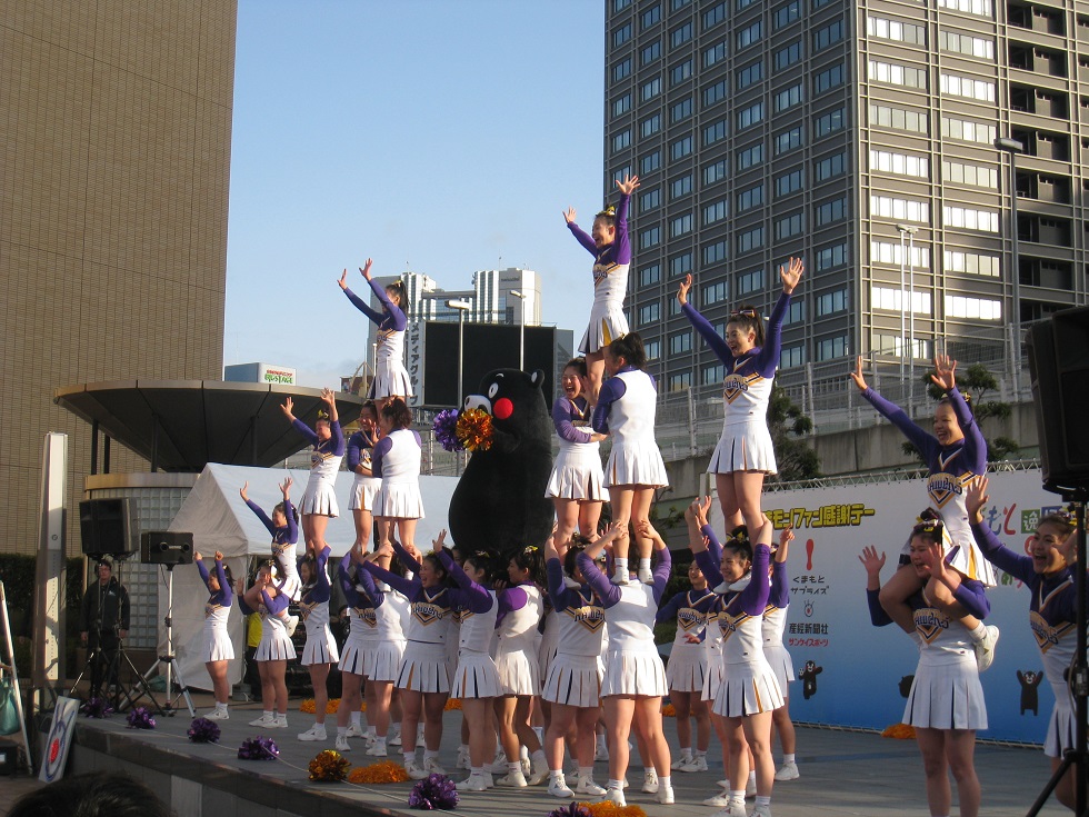 今年のファン感謝デーはご当地キャラ21人と熊本城おもてなし武将隊、土佐おもてなし勤王党、MICAさんの歌、梅花女子大チアリーディングとの共演など盛りだくさんのステージでした。くまモンとチアリーディングとのコラボでは、くまモンの身軽な素晴らしい演技にはびっくりさせられました。