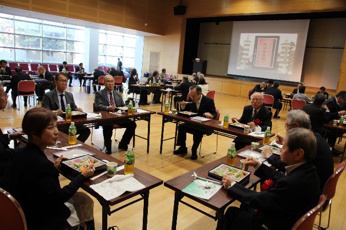 今回、表彰を受けたのは16名。その中で、武夫原会関係は私も含めて5名。文科からの2名は私と、同じ国文科卒の森正人先生(先生の方が1年後輩です)でしたので、お話ができて嬉しく思いました。 大阪の「国立循環器病センター」勤務から熊本に帰ってこられた小川久雄・新学長から、一人一人に、賞状と記念品を頂き、その後、記念撮影、昼食懇談会と続きました。懇談会の武夫原会のテーブルで、村田会長を中心に和やかなひと時を過ごさせていただきました。