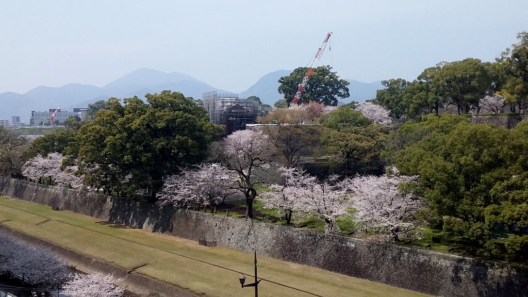 復旧工事が進む熊本城においても、薄桃色の美しいじゅうたんが、春の光に照らされ、きらきらと輝いています。工事クレーンと桜という珍しい光景を、いつの日か懐かしく思い出すことでしょう。