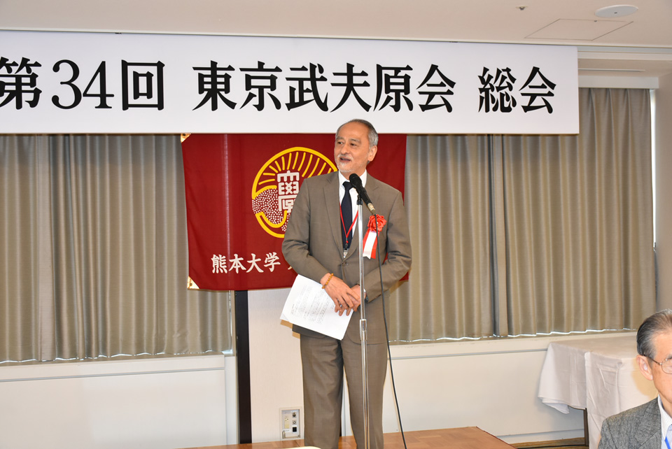 原田学長がスピーチされ、大学では「教育・研究・社会貢献」が重要な3本柱であること、このための体制を人事も含めて3年で作り上げたこと、後は魂を入れることが重要な仕事であるといった、躍動感ある熊本大学の将来に夢と希望を感じさせるお話しでした。