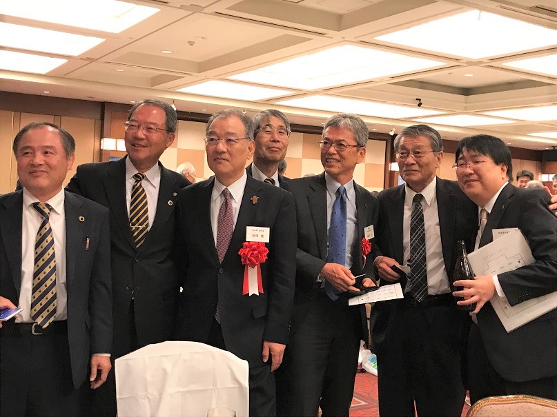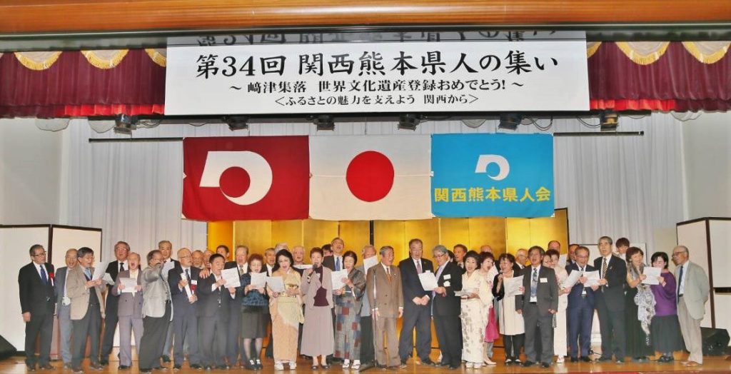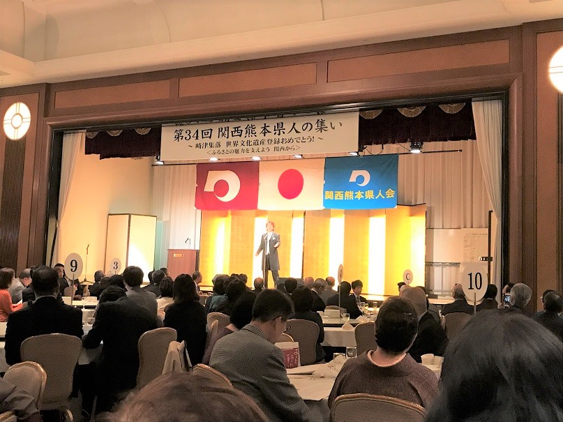 第34回関西熊本県人の集いが2018年11月10日(土)に太閤園で開催され、参加して来ました。武夫原会からの参加者は、本島会長、岡本事務局長、松田会計幹事と小生の4人でしたが、会場には300人を超す人が集まり、熊本弁が飛び交っていました。開会の前にくまモンとの記念撮影会があり、我々もくまモンと一緒に写真に納まったところから始まりました。宮崎正郎関西熊本県人会連絡協議会会長の主催者を代表しての挨拶では、熊本城復興支援に取り組み熊本市長から感謝状を受け取ったとの報告や秋から冬、更には来年にかけてのイベント(観光物産展、全国高校駅伝、都道府県対抗駅伝、ラグビーワールドカップ、女子ハンドボール世界選手権等)の紹介があり、参加・応援の呼びかけがありました。