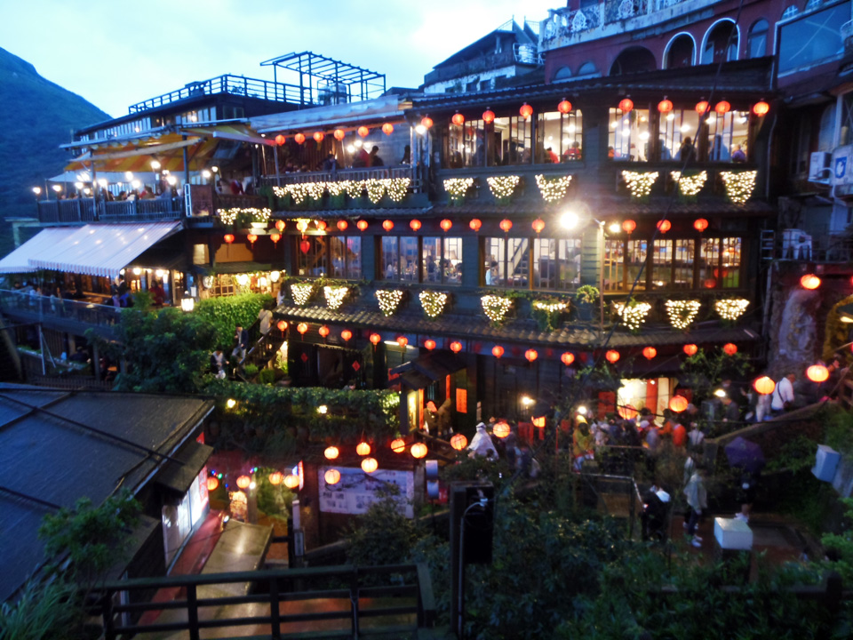 台北近郊にある仇分の夜景。あの 「千と千尋の神隠し」の舞台のモ デルになった場所として有名。こ の日も観光客でいっぱいでした。 |