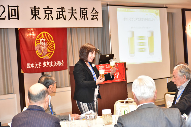 第2部の講演では、キリンビールマーケティング株式会社栃木支社長の神元佳子様(第38回、文学部卒)から、「ホントは奥深い、ビールの話」というテーマで講演があり、ビール好きの左党にとっては聞き逃すことのできない内容でした。先ずは全員にビールができるまでの工程の中での一番絞り、二番絞りの原酒(通常ではビール工場の中でしか味わうことができない)が配られ、それを実際に試飲して一番絞りのうまみを実感してから講演に入りました。講演は、プロジェクターに投影して栃木県のローカル色豊かなお話、本題のビールにまつわるお話、そして市販されている缶ビールをひときわ美味しく味わうためのウラワザの伝授、泡をたっぷりグラスに膨らませる注ぎ方などの実演もあり、全体を通して神元様のテンポのよいスピーチで進み、講演の最後には“一番絞り熊本づくり”が全員にプレゼントされ、興味深い目からうろこの講演を楽しむことができました。