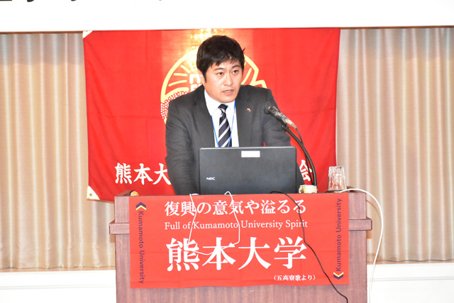 続いて、熊本県東京事務所くまもとビジネス推進課主幹亀井誠様(第43回、法学部卒)から「熊本地震の復旧・復興の現状報告」の講演があり、同様にプロジェクターの映像で被害の甚大さとそこからの復旧・復興状況の説明がありました。それとあいまって総会会場内の壁面には、震災の状況と、復旧・復興の状況を説明するシートが十数枚展示されていました。