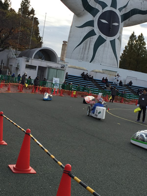 10月30日に行われた予選大会では、日産自動車九州㈱特設コースで開催され、三池工業高校のMK-Spirit号が学生の部4位に入賞し、原付バイク用の小さいバッテリで約16800m走ることができました。