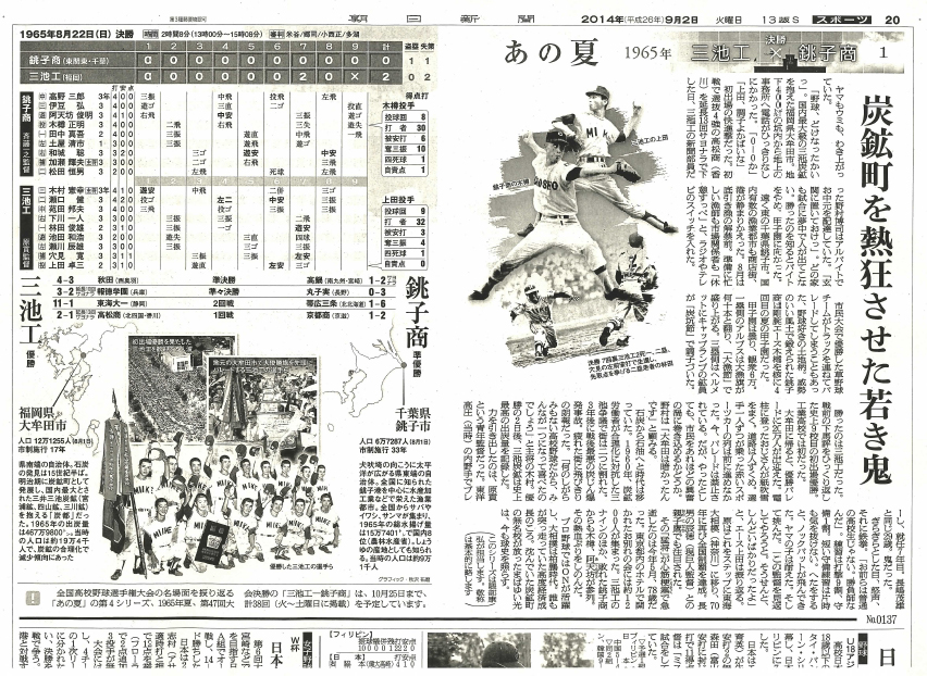 本日(H26.9.2)の朝日新聞スポーツ覧に1965年8月22日(日)三池工業高校野球部が銚子商(東関東・千葉)との決勝戦をおこなった記事が載っていました。