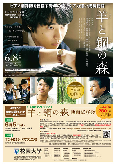 上映した映画は、6月8日(金)に全国ロードショーをひかえた文部科学省選定映画「羊と鋼の森」。本屋大賞を受賞したベストセラー小説を映画化したものです。来場者には、花園大学ガイドブックやオープンキャンパスの案内を配布、さらに上映前の時間を使い、大スクリーンで花園大学インフォメーションビデオを上映、続いて丹治学長が舞台挨拶を行いました。