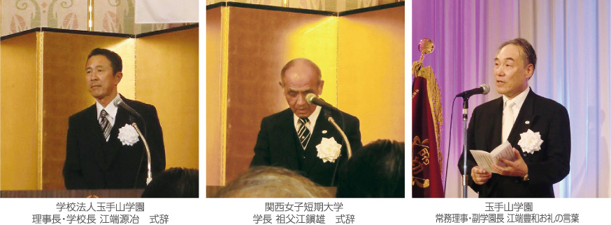 記念式典では江端理事長・祖父江学長の挨拶・大阪私立短期大学協会 奥田会長より祝辞を頂き、参加者皆で懐かしい学園歌を合唱しました。