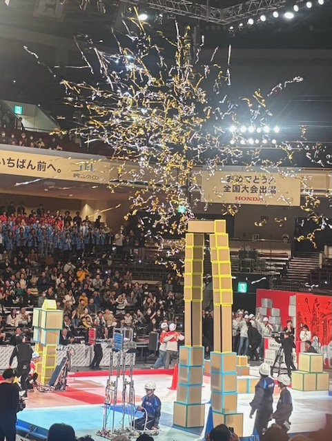 シード枠で2回戦から出場し、旭川高専と対戦しました。4m20cmのゲート作成に挑みましたが、ロボットとの通信が途絶えるなどのトラブルでゲート作成が難航し、試合終了4秒前に積み上げたもののゲートが倒れ、10対560で敗退しました。しかし、1回戦・2回戦で惜しくも敗退したもののその戦いぶりが優れていたチームを審査員が選出し、準々決勝に進むことができる権利であるワイルドカード枠に選出されました。準々決勝では、富山高専(射水)との対戦で、通信不良は続いていましたが、操作技術でカバーして3m20cmのゲートを完成し、390対15で勝利しました。準決勝では、産技高専(荒川)と対戦しました。序盤、共有ゾーンでボックスの取り合いになる、ボックスを落としてペナルティーを受けるなどして苦戦したものの、慌てることなく3m20cmのゲートを完成させ、370対310で勝利しました。決勝戦の相手は、2回戦で敗れた旭川高専でした。雪辱を果たすべく、大会最大となる4m20cmのゲートを完成させ475点を獲得しましたが、旭川高専の周回作戦による得点に届かず、475対490で敗れました。しかし、大会最大のゲート作成に挑み、完成させたことは会場を大いに沸かせ、見事「ロボコン大賞」を受賞しました。